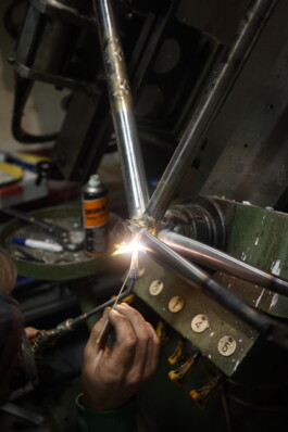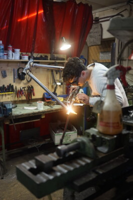 Drawing inspiration from classic road bike geometries, the objective was to modernize and adapt them into a sleek and contemporary cyclocross frame. The primary focus was to create a stable and agile design that not only considers the forces at play but also showcases them visually. This bicycle is specifically crafted for cross-country expeditions and brief bikepacking journeys. The frame is meticulously hand brazed and double powder coated to achieve an eye-catching shimmering effect. Made in Switzerland with the support of Bedovelo.